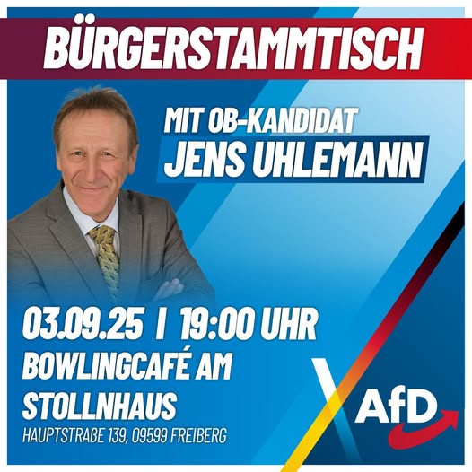 Am 3. September um 19 Uhr im Freiberger Ortsteil Zug, im Bowlingscafé am Stollnhaus (Hauptstraße 139. 09599 Freiberg) lade ich Sie zum Bürgerstammtisch anlässlich der Freiberger Oberbürgermeisterwahl 2025 ein.